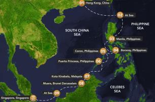 Begin in vibrant Hong Kong, move to the romantic, historical pulse of Manila, and find slow kisses on the cerulean shores of Boracay. Explore Coron’s secret lagoons and the lush sensuality of Puerto Princesa. Wander the exotic markets of Kota Kinabalu and surrender to the quiet mystery of Muara before reaching the futuristic elegance of Singapore.
